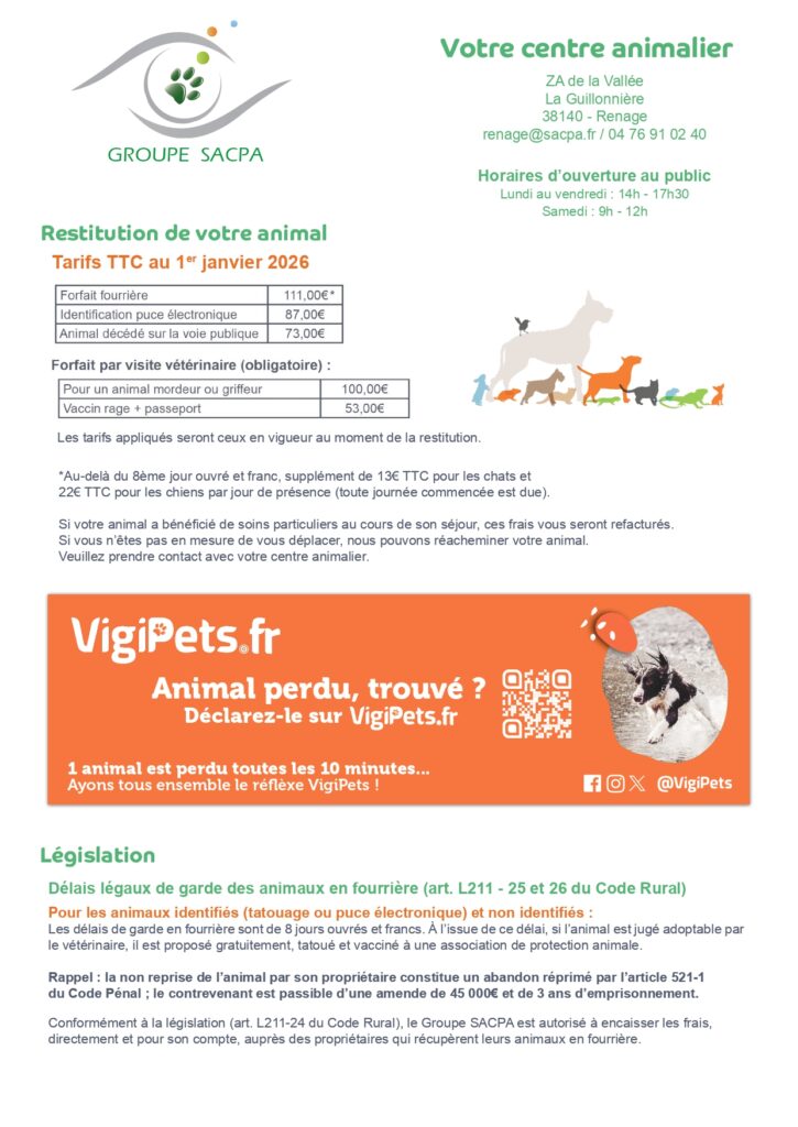 Pour information si votre animal est trouvé et errant et emmené par notre partenaire “La SACPA” en fourrière, des tarifs de restitution seront à payer car pour rappel l’identification d’un animal est OBLIGATOIRE et les soins prodigués à votre animal à la fourrière ont un coût.