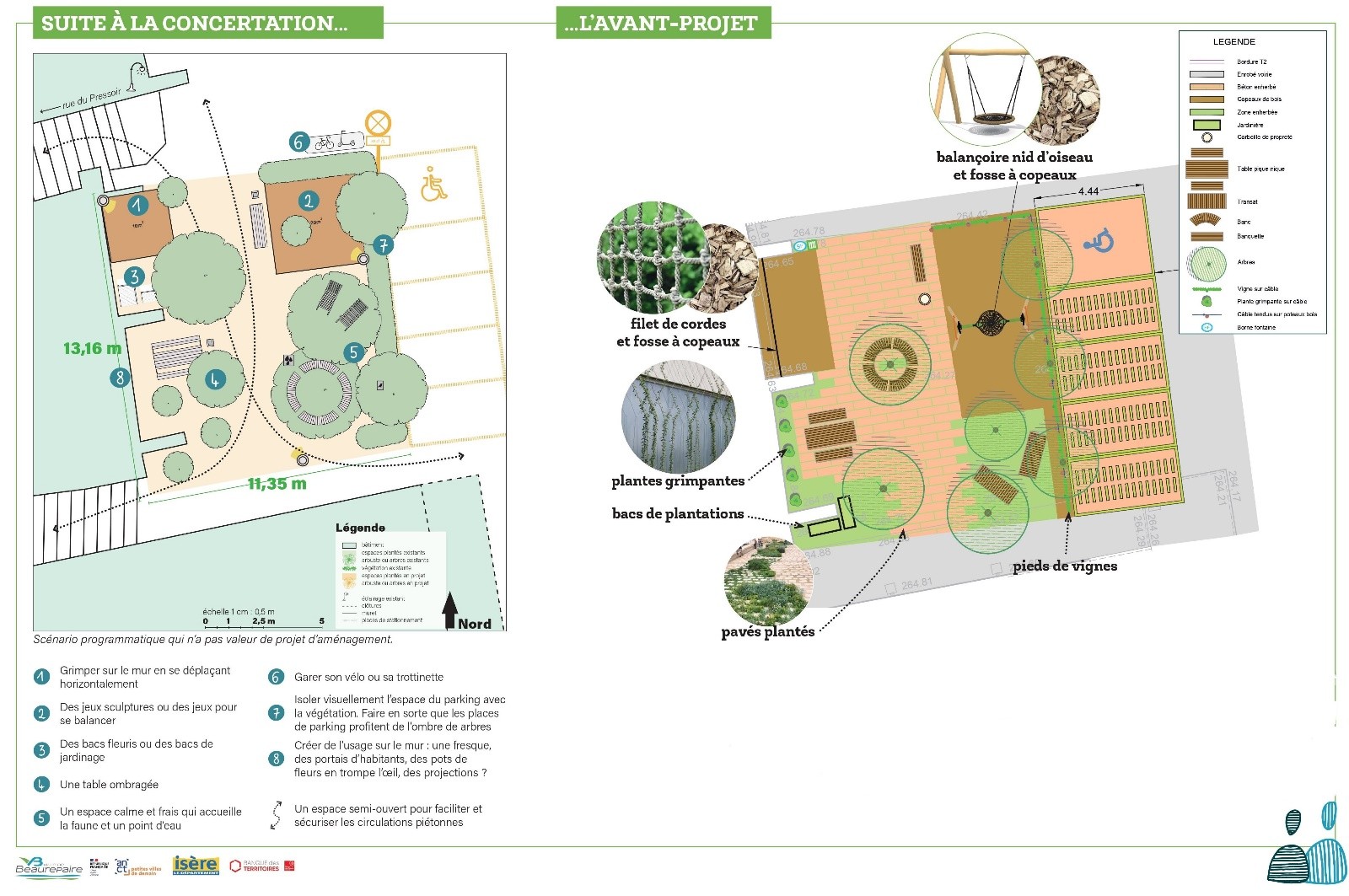 Cet avant-projet reprend les principaux usages souhaités par les habitants/riverains : grimper sur le mur, un jeu pour se balancer, des bacs à fleurs/jardinières, un espace calme et frais, garer son vélo ou sa trottinette, mettre de la végétation pour que les places de parking profitent de l’ombre des arbres, un espace semi-ouvert pour faciliter et sécuriser les circulations piétonnes… .